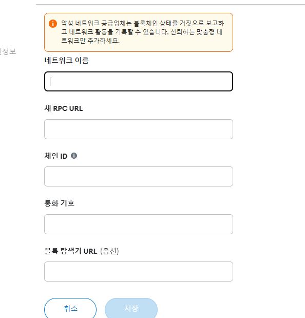 상단 네트워크 버튼을 클릭하여 네트워크 추가를 누르세요.