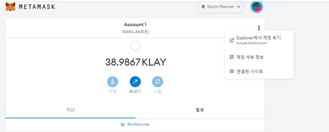 메타마스크 상단 계정 이름 아래에 있는 0x로 시작하는 것이 퍼블릭키 입니다. 누르면 자동으로 복사됩니다. 그리고 햄버거 버튼을 클릭하여 계정 세부 정보를 클릭하세요.