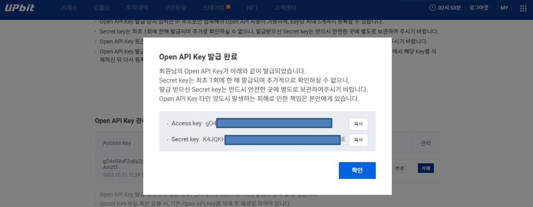 Open API Key 발급 완료가 뜨면 Access Key와 Secret Key를 복사해두세요.